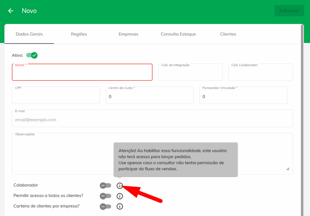 A flag Colaborador agora possui uma explicação clara dentro do cadastro, informando gestores que: